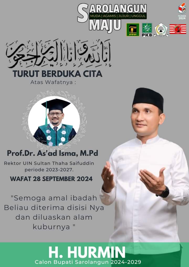 Merangintoday.com,SAROLANGUN -Kabar duka atas meninggalnya Rektor Universitas Islam Negeri Sultan Thaha Saifuddin (UIN STS) Jambi, Prof. Asad Isma, Sabtu siang (28/9/2024), menyentuh banyak kalangan, termasuk Calon Bupati Sarolangun Nomor Urut 5 H.Hurmin, Dalam pernyataannya menyampaikan rasa belasungkawa yang mendalam atas kepergian tokoh Jambi dan tokoh pendidikan yang dikenal bersahaja dan berdedikasi tinggi tersebut.